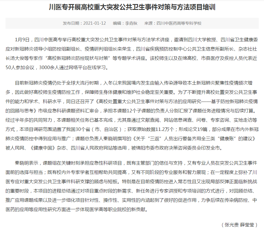 媒体报道 当前位置: 首页 >> 媒体报道 >> 正文 四川教育网:川医专开展高校重大突发公共卫生事件对策与方法项目培训 发布日期:2021-01-12 点击: 链接地址:http://www.scedu.net/info/1067/78352.htm 上一篇:四川党建之声:川医专开展高校重大突发公共卫生事件对策与方法项目培训 下一篇:今日头条:追根溯源再话中医药 温故知新论传承发展