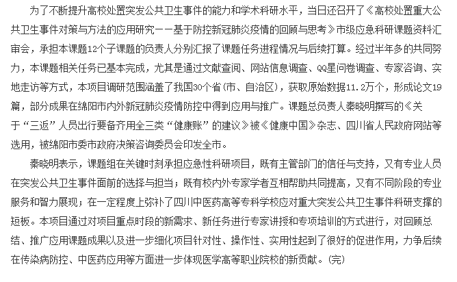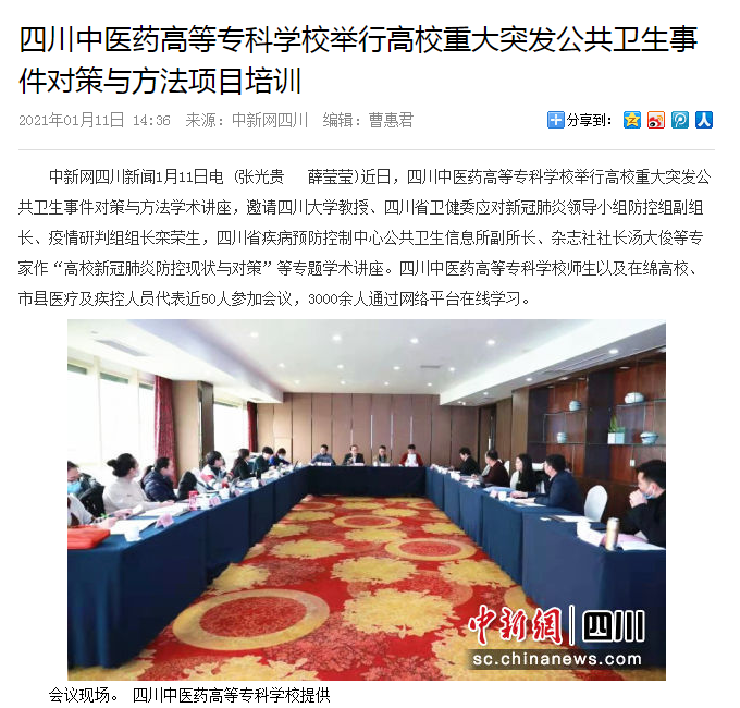 媒体报道 当前位置: 首页 >> 媒体报道 >> 正文 中国新闻网:四川中医药高等专科学校举行高校重大突发公共卫生事件对策与方法项目培训 发布日期:2021-01-11 点击: 链接地址:http://www.sc.chinanews.com/bwbd/2021-01-11/141331.html 上一篇:四川在线:川医专举行高校重大突发公共卫生事件对策与方法项目培训 下一篇:绵阳广播电视台•绵阳新闻:高校突发公共卫生事件预防与处置研讨会举行