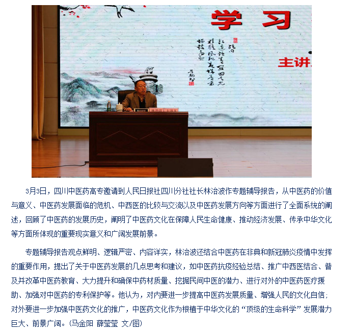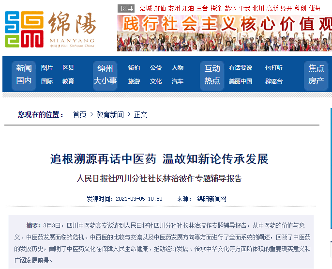 媒体报道 当前位置: 首页 >> 媒体报道 >> 正文 绵阳新闻网:人民日报社四川分社社长林治波作专题辅导报告 发布日期:2021-03-05 点击: 链接地址:http://www.myrb.net/html/2021/news/3/275358.html 上一篇:今日头条:追根溯源再话中医药 温故知新论传承发展 下一篇:今日头条:四川医专红十字基地举行“救在身边”助力疫情防控