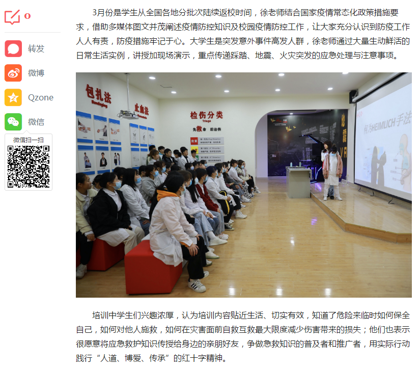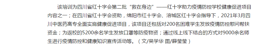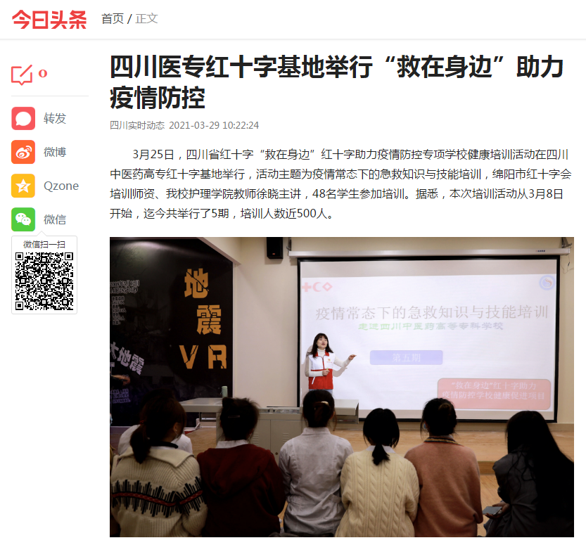 媒体报道 当前位置: 首页 >> 媒体报道 >> 正文 今日头条:四川医专红十字基地举行“救在身边”助力疫情防控 发布日期:2021-03-29 点击: 链接地址:https://www.toutiao.com/i6944895104641565198/?tt_from=weixin&utm_campaign=client_share&wxshare_count=1×tamp=1617009502&app=news_article&utm_source=weixin&utm_medium=toutiao_android&use_new_style=1&req_id=202103291718220101511941535400AF96&group_id=6944895104641565198 上一篇:绵阳新闻网:人民日报社四川分社社长林治波作专题辅导报告 下一篇:现代职业教育网:四川医专红十字基地举行“救在身边”助力疫情防控