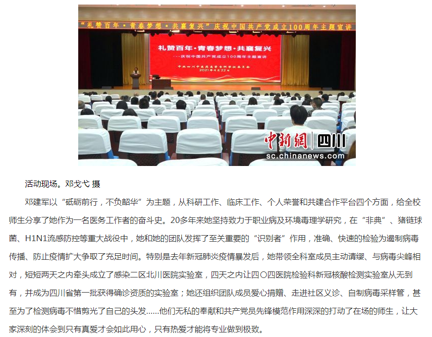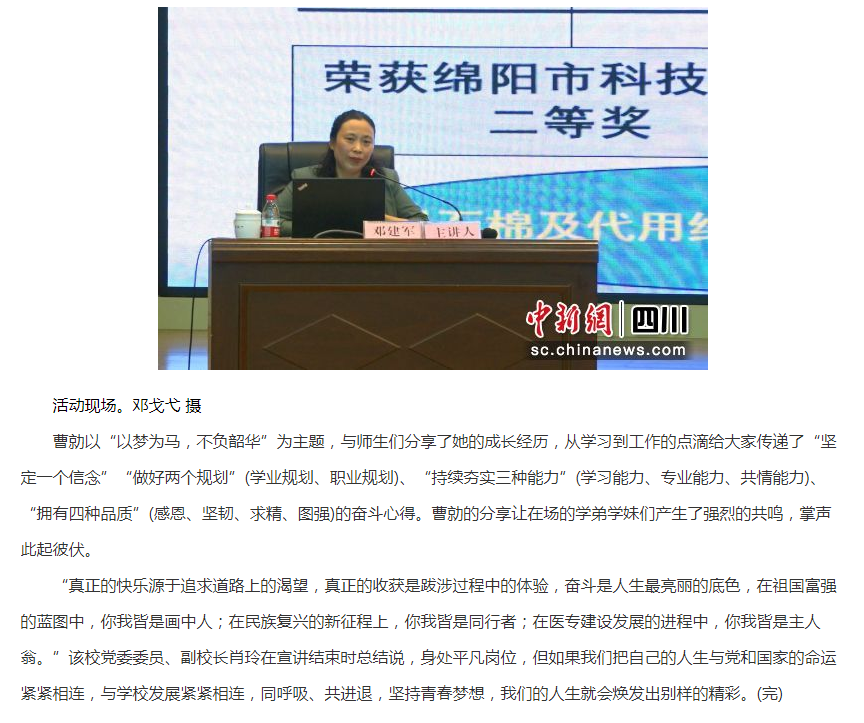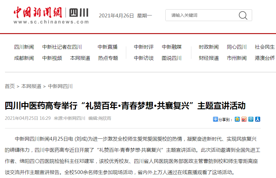 媒体报道 当前位置: 首页 >> 媒体报道 >> 正文 中国新闻网:四川中医药高专举行“礼赞百年·青春梦想·共襄复兴”主题宣讲活动 发布日期:2021-04-25 点击: 链接地址:http://www.sc.chinanews.com/bwbd/2021-04-25/147448.html 上一篇:绵阳教育体育网:四川中医药高专举行“礼赞百年·青春梦想·共襄复兴”主题宣讲活动 下一篇:中国新闻网:四川中医药高专举行“礼赞百年·青春梦想·共襄复兴”主题宣讲活动