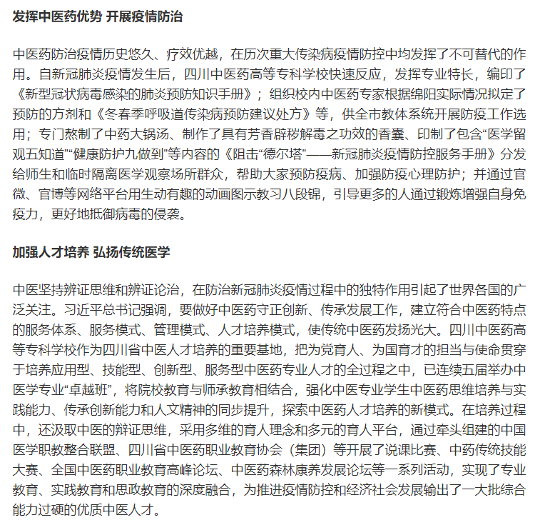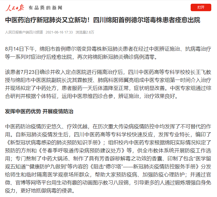 媒体报道 当前位置: 首页 >> 媒体报道 >> 正文 人民日报:中医药治疗新冠肺炎又立新功!四川绵阳首例德尔塔毒株患者痊愈出院 发布日期:2021-08-16 点击: 文章地址:https://wap.peopleapp.com/article/6281334/6176448 上一篇:《经济参考报》:阻击德尔塔病毒 四川中医药这样发力 下一篇:四川省教育厅:川医专:全力做好疫情防控工作 疫苗接种完成百分百