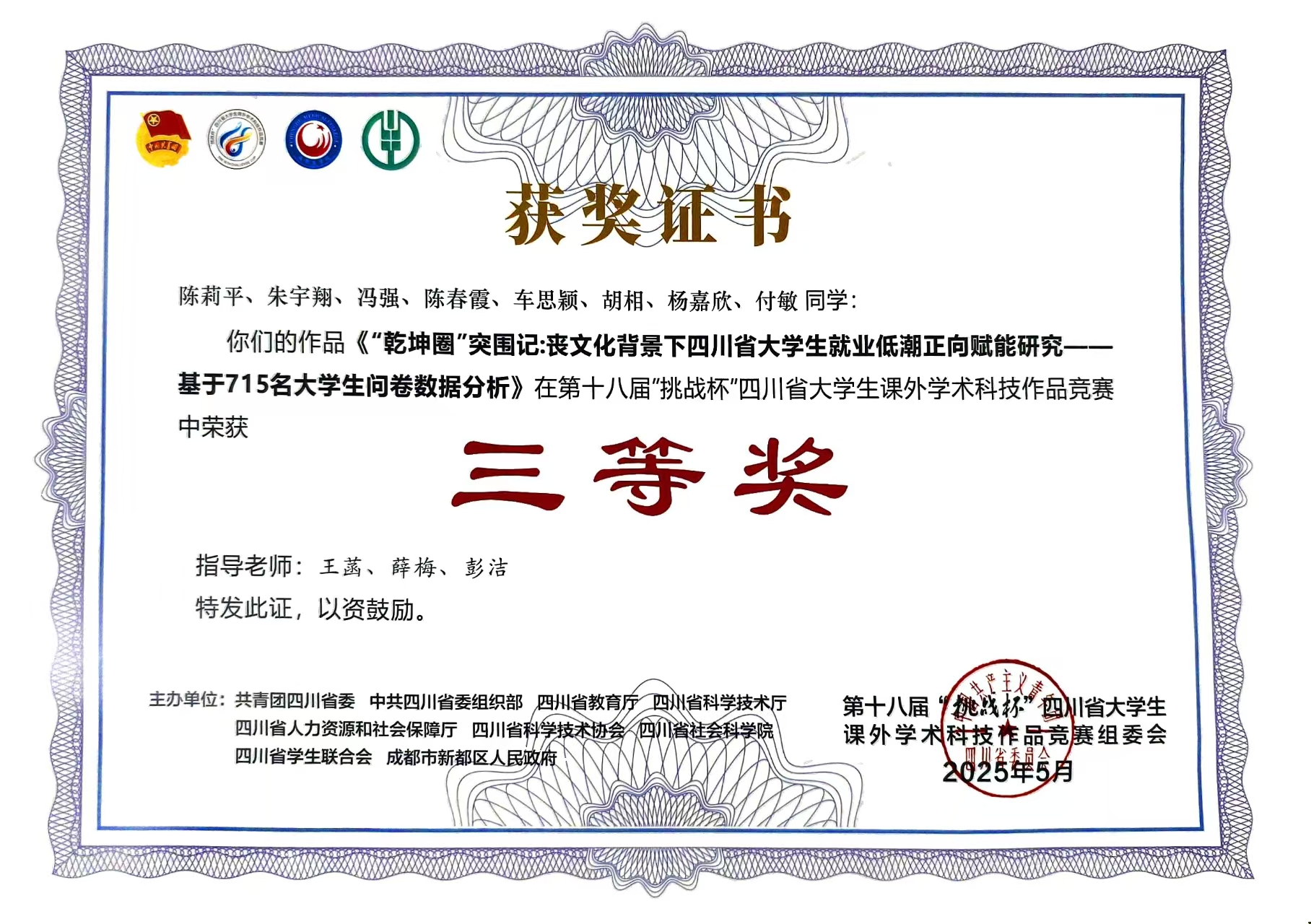 热烈祝贺我院学生在第十八届“挑战杯”四川省大学生课外学术科技作品竞赛中荣获省级三等奖!在此,特向全院师生报喜!