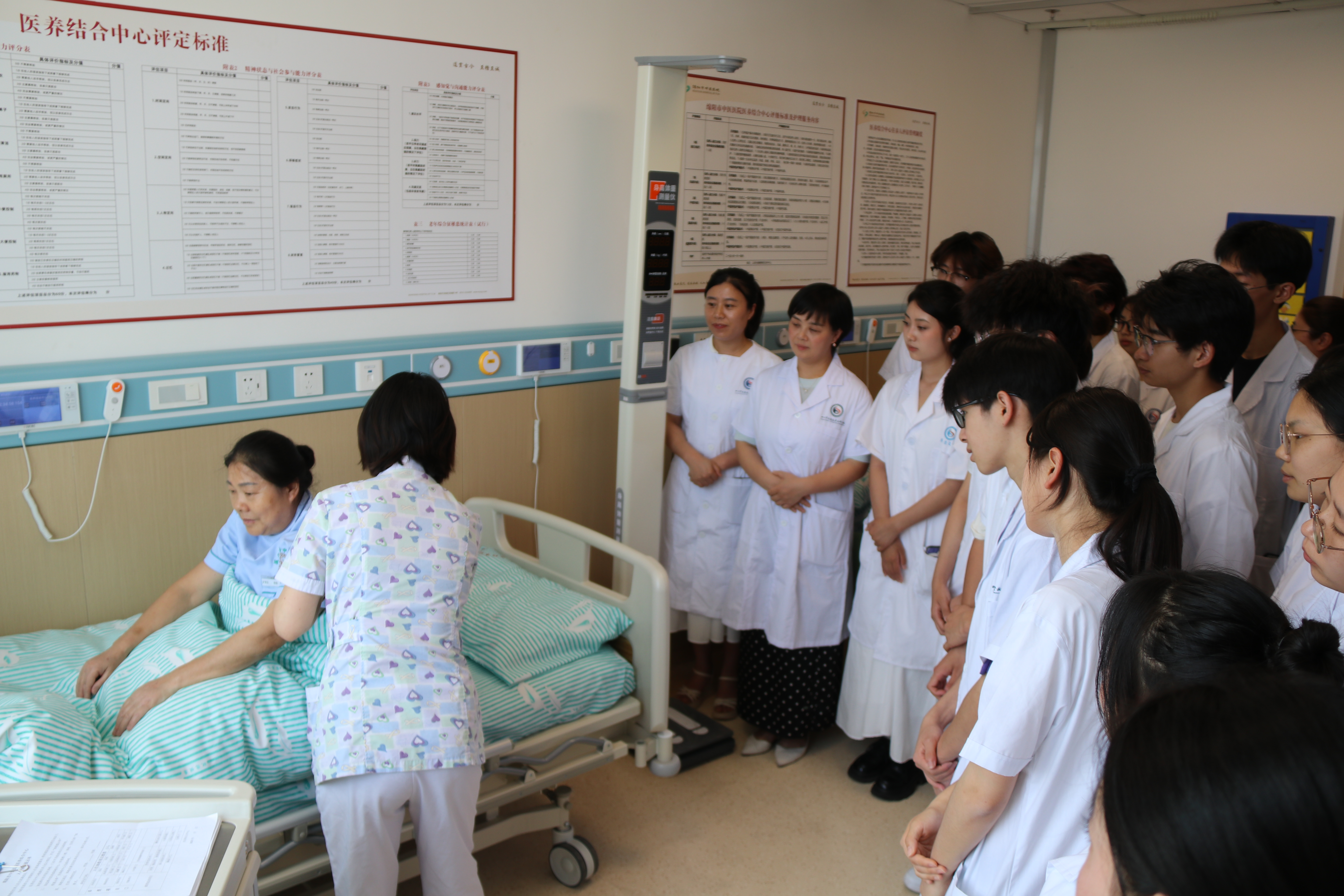 学生见习观摩: 医养结合中心护士长苟魏霞精心组织了老年人入住评估流程的现场观摩。随后,苟护士长亲自示范了协助老年人有效咳嗽咳痰的专业照护技巧,为学生提供了直观、专业的实践范本。