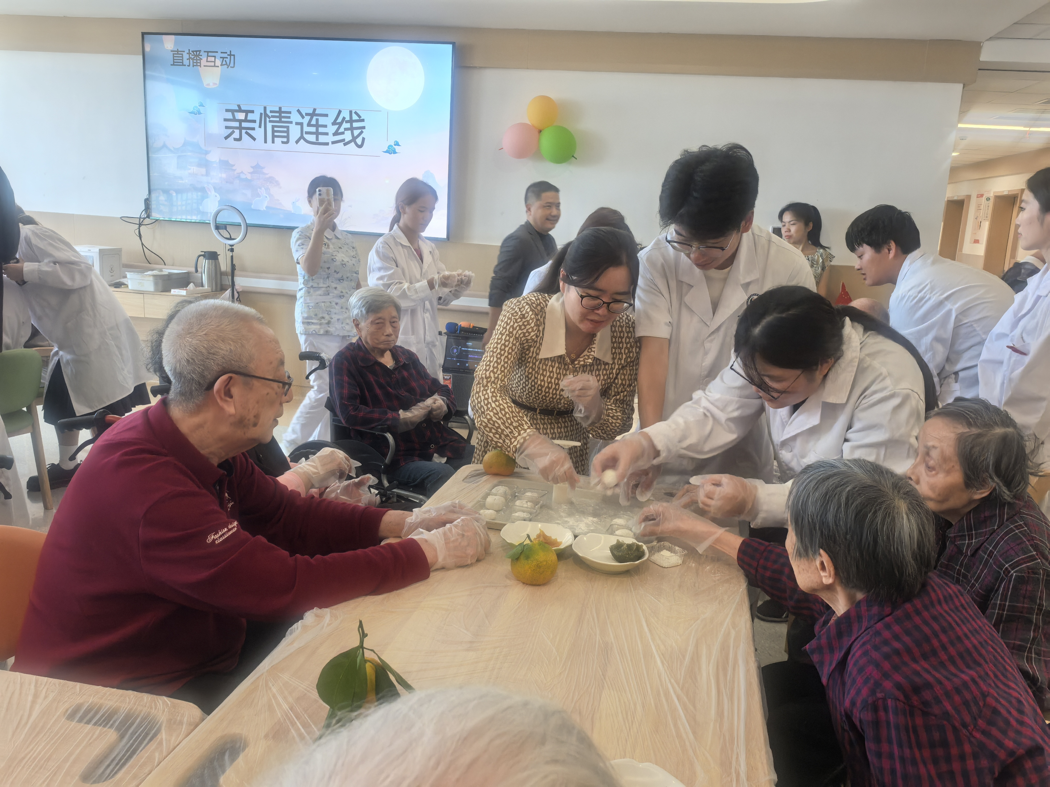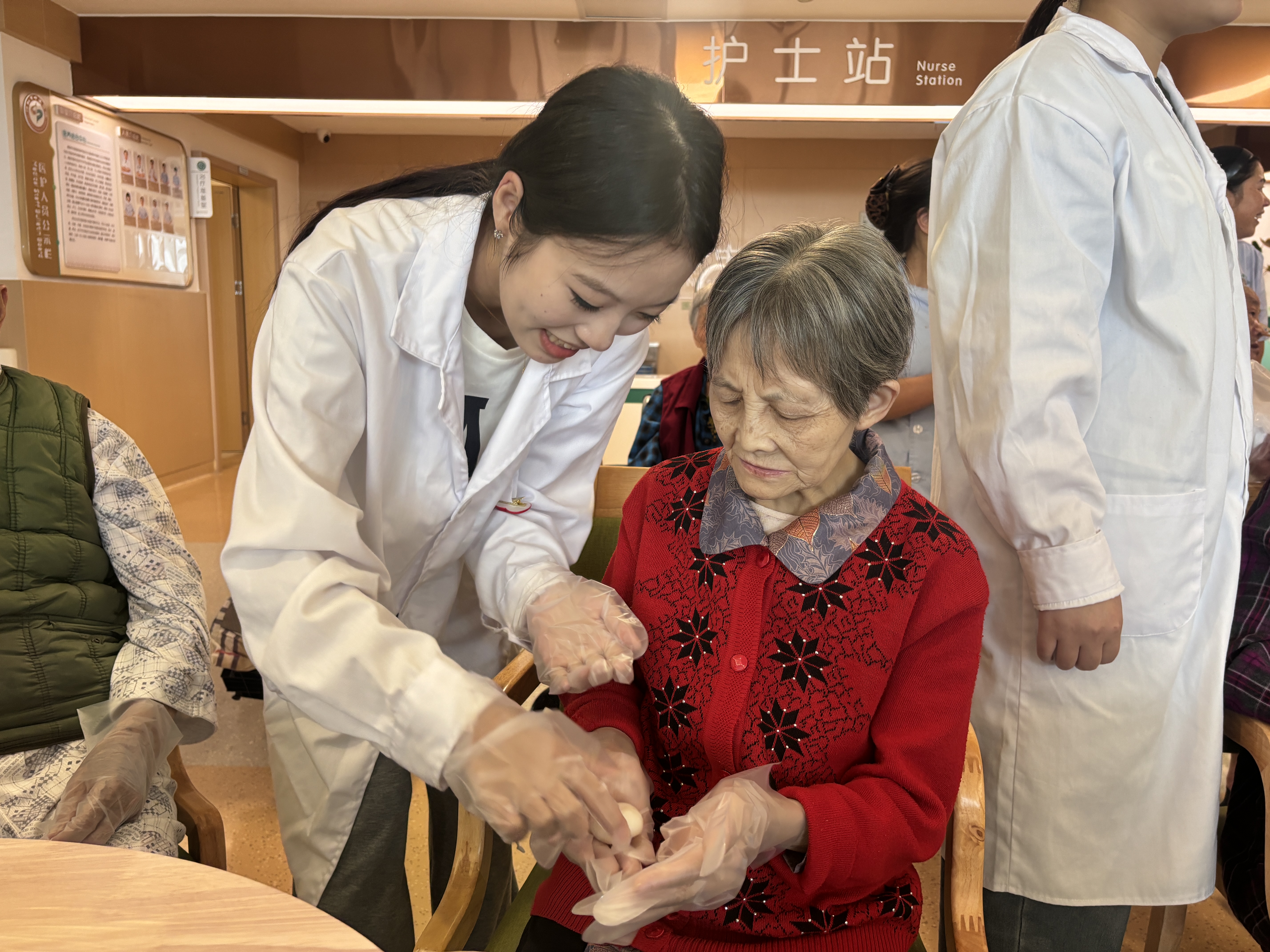 下午,活动进入手工月饼制作环节。附属医院教师提前筹备材料,同学们以“一对一”“一对多”形式,指导老人们完成面团揉制、馅料包裹、模具压制等步骤,期间交流中秋习俗,现场节日氛围浓厚。活动尾声,学生将月饼包装后送至老人手中,并致以双节祝福,老人们对活动给予高度评价。