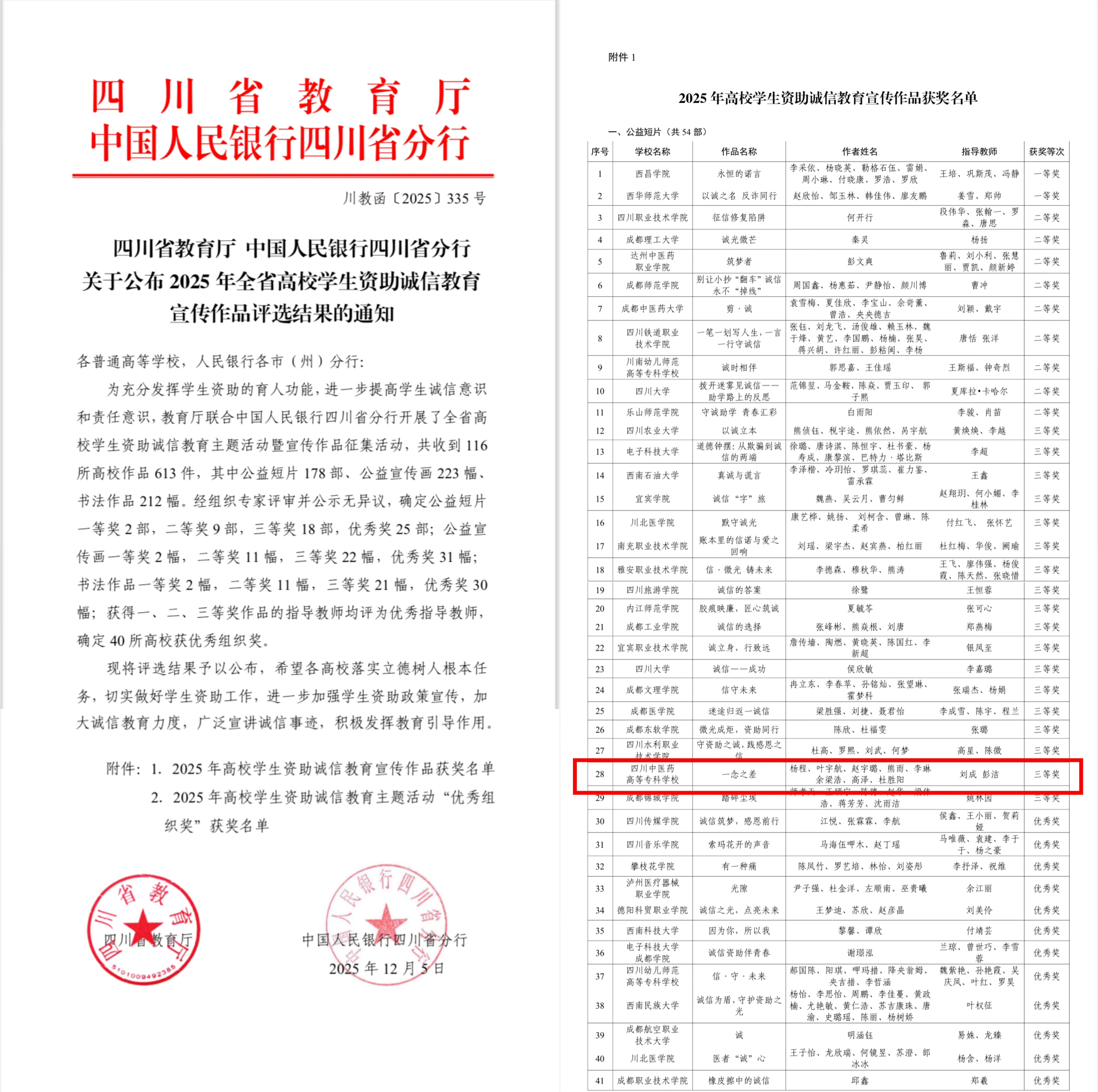 近日,由四川省教育厅、中国人民银行四川省分行联合主办的2025年全省高校学生资助诚信教育宣传作品评选圆满落幕。本次活动吸引了全省116所高校的613件作品同台竞技。我院师生团队原创短视频《一念之差》,凭借贴近校园的真实剧情、深刻的诚信主题表达以及精良的制作水准,在众多优质作品中脱颖而出,荣获公益短片类三等奖!