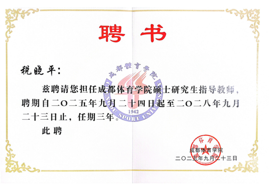 近日,经成都体育学院严格遴选与审批,养生康复学院税晓平教授正式获批成为硕士研究生导师,为院高层次人才队伍注入新鲜力量,对提升教学科研水平、推进学科发展及本科专业建设申报具有重要意义。