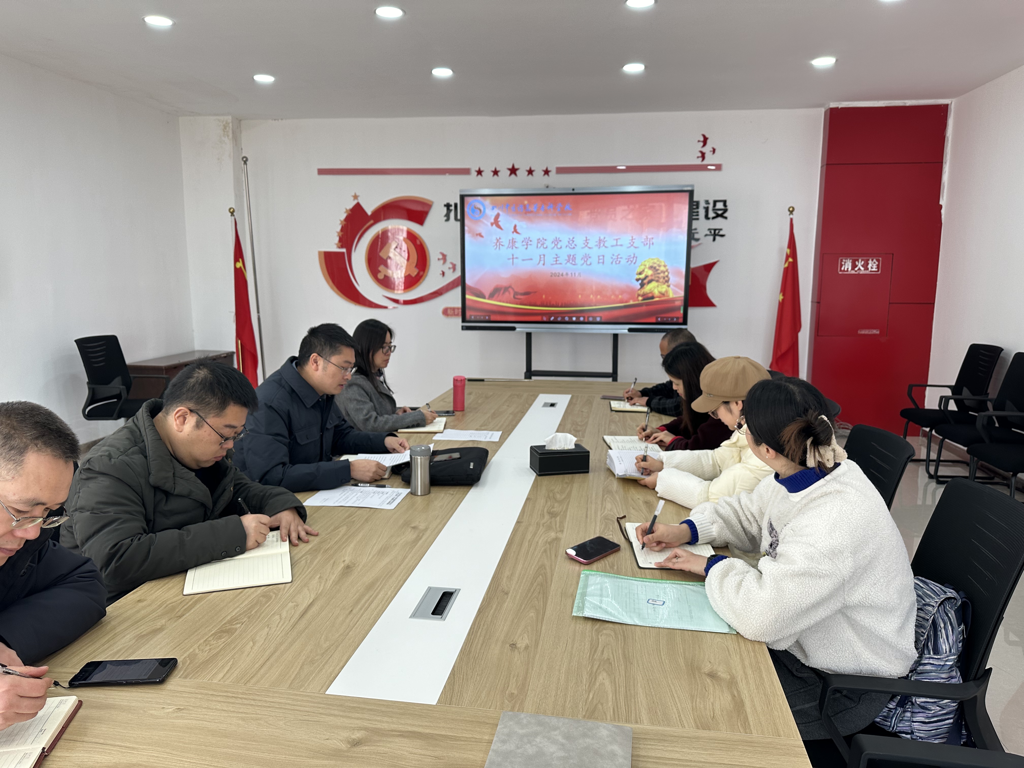 2024年11月28日中午,养生康复学院党总支教工支部、学生支部在党员活动室联合开展了本月主题党日活动,会议由党总支书记刘成主持,养生康复学院党总支全体党员参加。