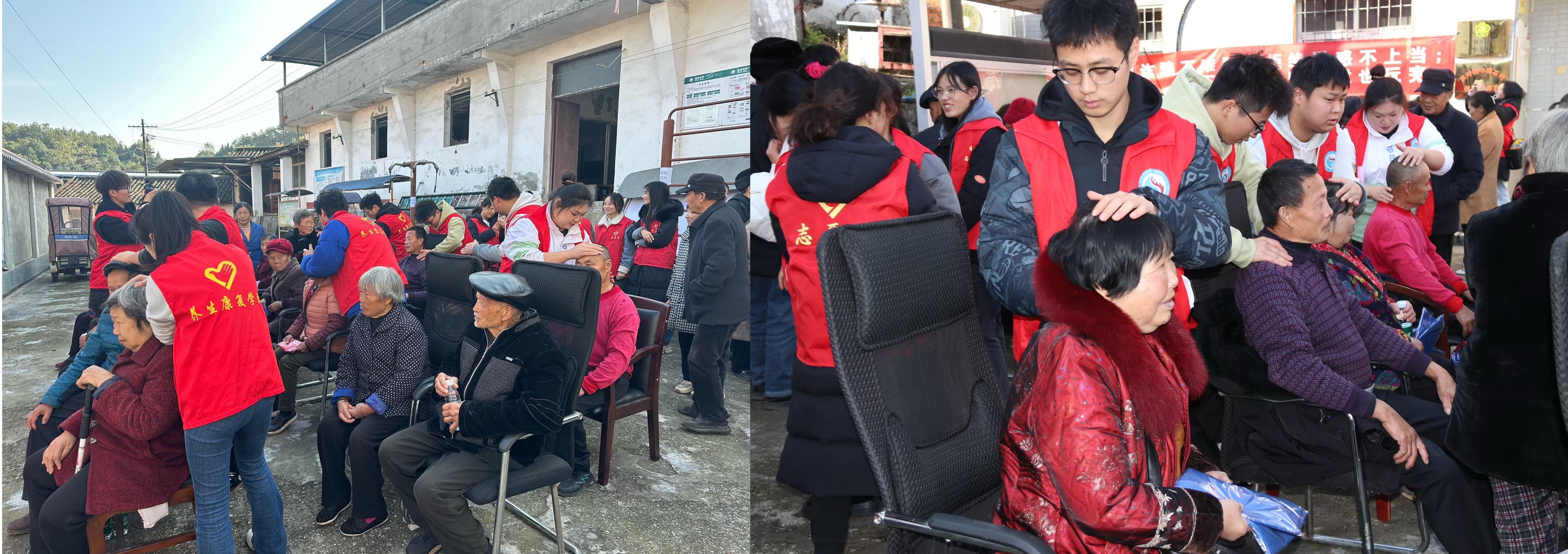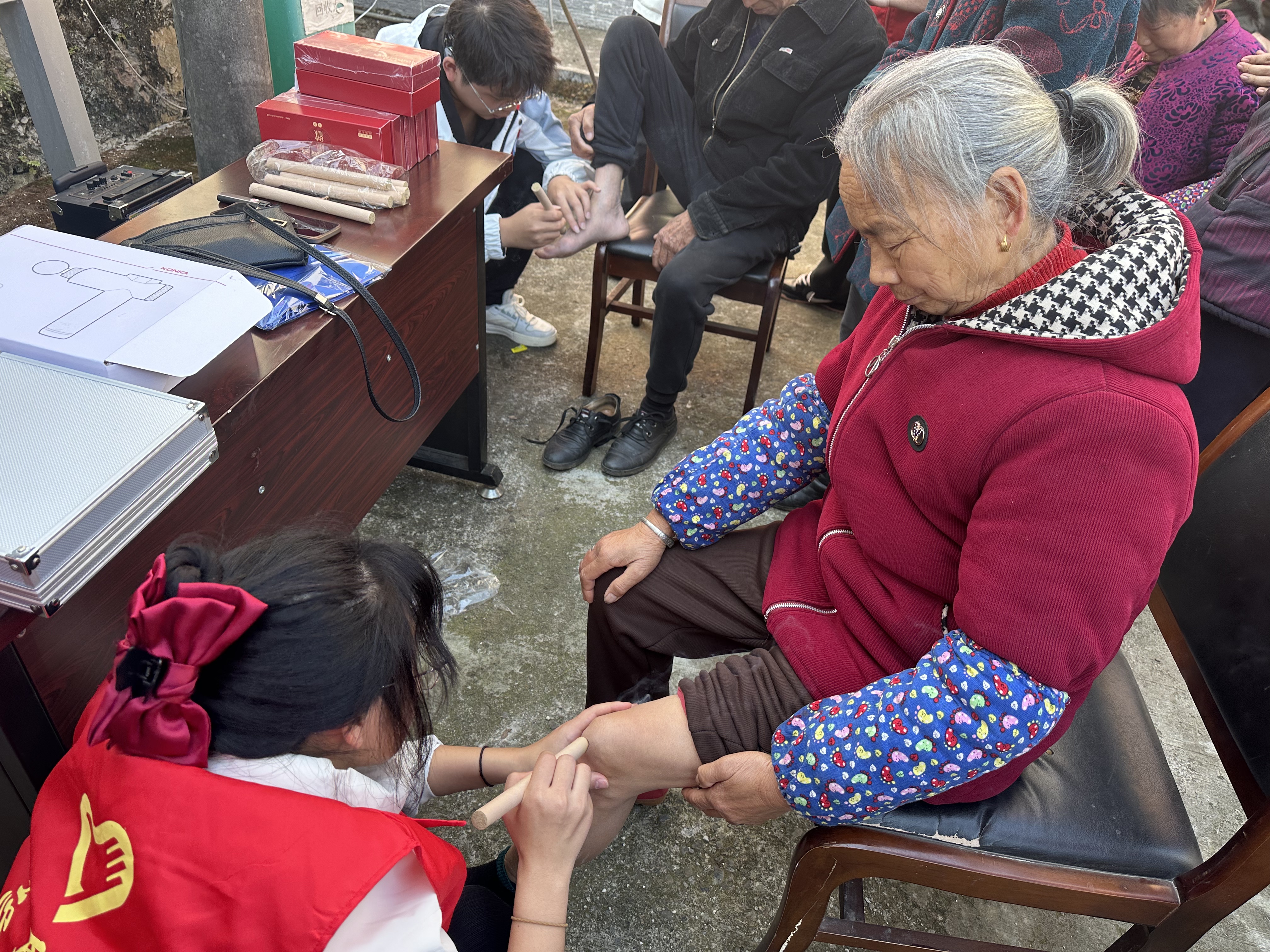志愿服务现场,志愿者们分成了几个组,开展了推拿、艾灸、测量血压、血糖以及护牙宣传等志愿服务活动。来自养生康复学院的志愿者们运用专业推拿手法,为长期劳作的村民们舒缓身体的酸痛与不适,耐心询问他们的日常习惯,给予针对性的保健建议。同时,艾灸服务也备受欢迎,温热的艾条在志愿者们手中熟练操作,帮助村民们祛湿散寒、调理身体。医学技术学院的志愿者们则认真为村民们测量血压、血糖,仔细记录数据,并结合每个人的身体状况,给予饮食、运动等方面的健康指导。此外,护牙宣传活动也如火如荼地进行着,志愿者们向村民们普及口腔卫生知识,发放护牙用品,引导大家养成良好的口腔护理习惯。