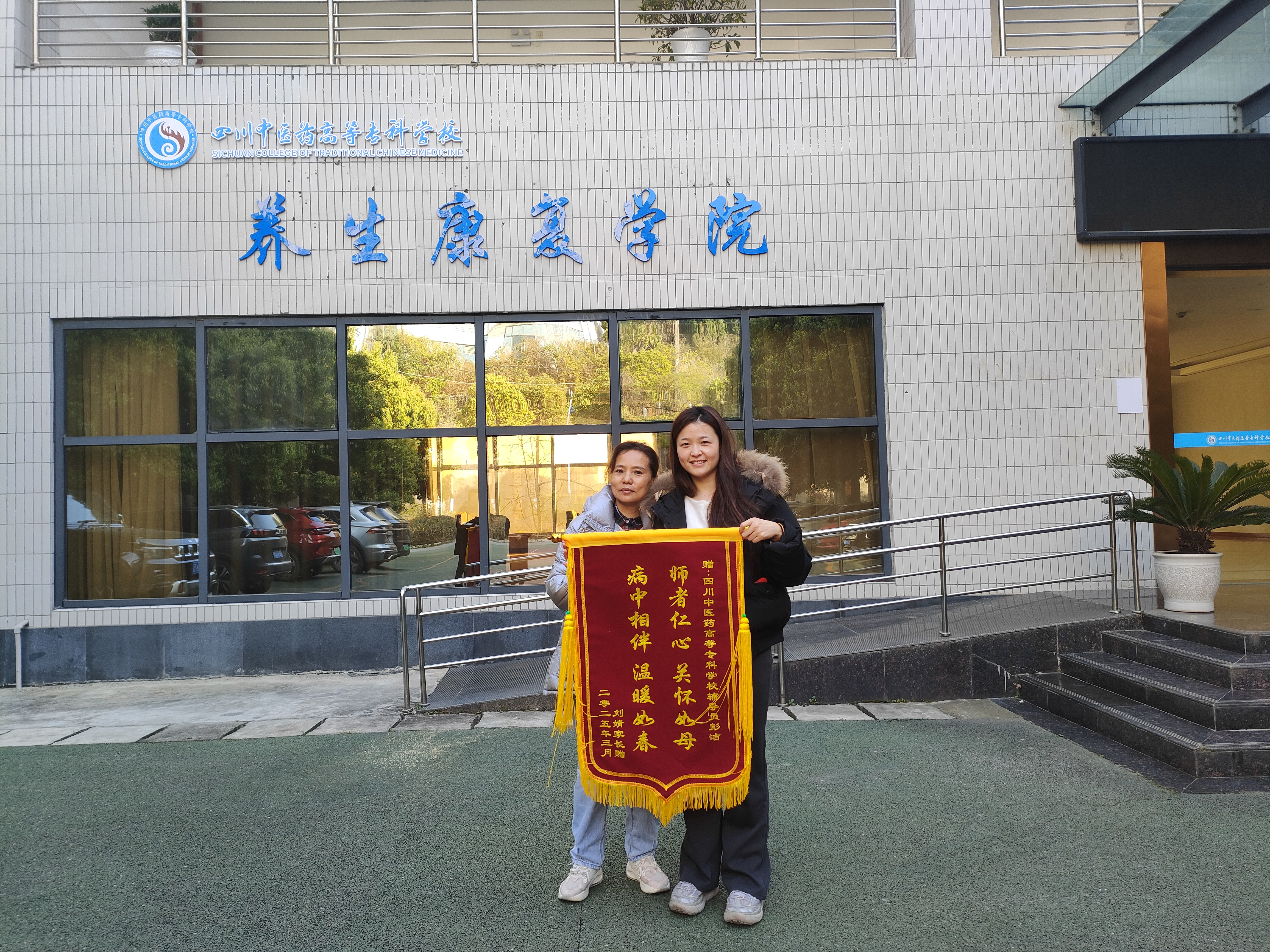 近日,养生康复学院内温情涌动,一幕感人场景悄然上演。学生家长龚女士怀着诚挚的感恩之心,将一面锦旗郑重地送到学院辅导员彭洁老师手中。锦旗上“师者仁心关怀如母,病中相伴温暖如春”的烫金大字,与学院“红智善养”党建品牌交相辉映。