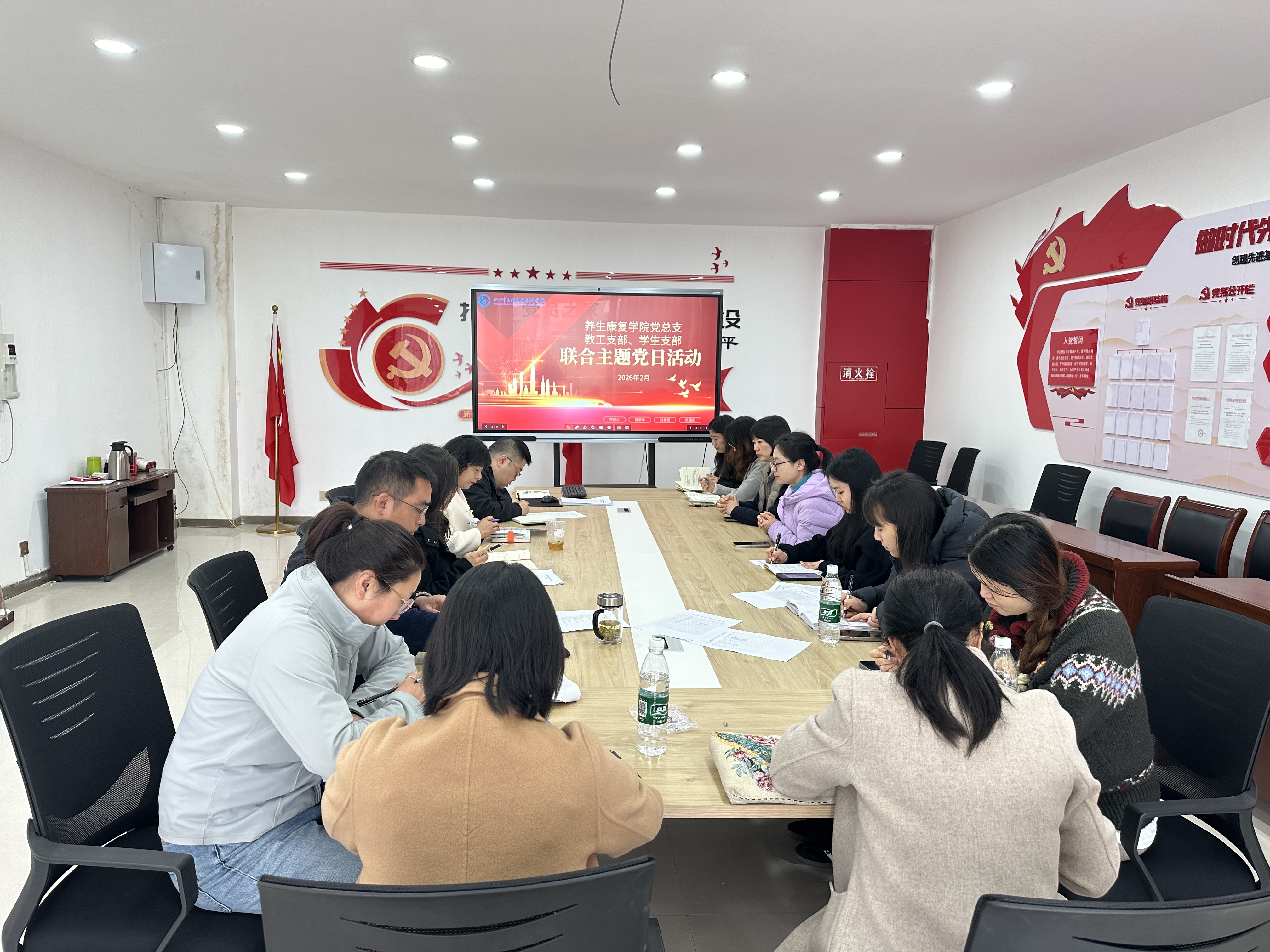 为深入学习贯彻党的最新理论精神,严明党纪法规,强化党员廉洁自律意识,凝心聚力开启新年度工作新局,2026年2月27日上午11点,养生康复学院党总支教工支部、学生支部在学院党员活动室开展以“凝心聚力开好局・砥砺奋进新征程”为主题的联合主题党日活动,党总支全体党员参加此次活动。