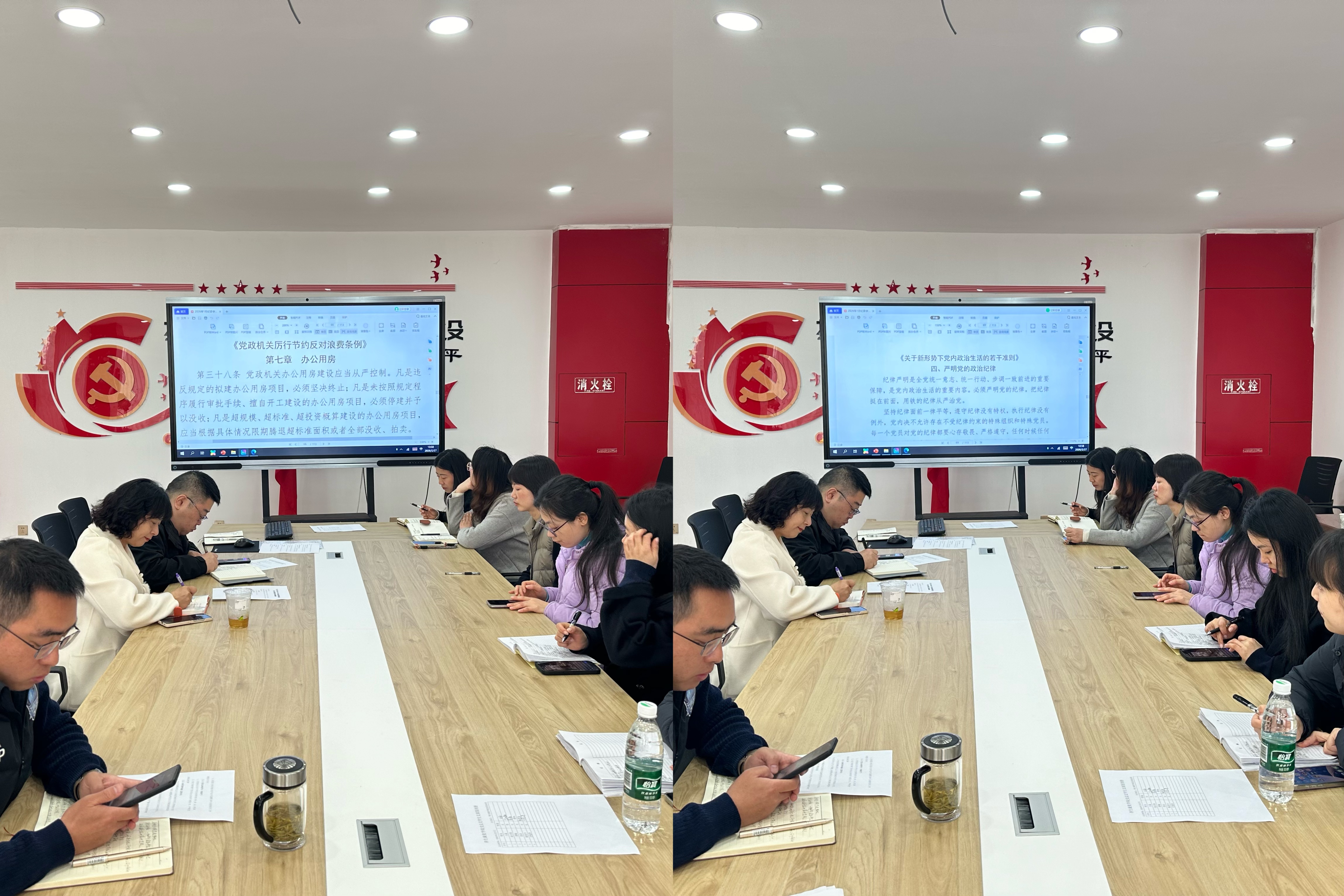 随后,教工支部书记税晓平带领全体党员开展党纪法规学习,重点研读《党政机关厉行节约反对浪费条例》第七章办公用房、《关于新形势下党内政治生活的若干准则》中严明党的政治纪律相关内容,进一步明确党员干部在工作作风、政治纪律方面的行为准则,增强党员的规矩意识和制度意识。