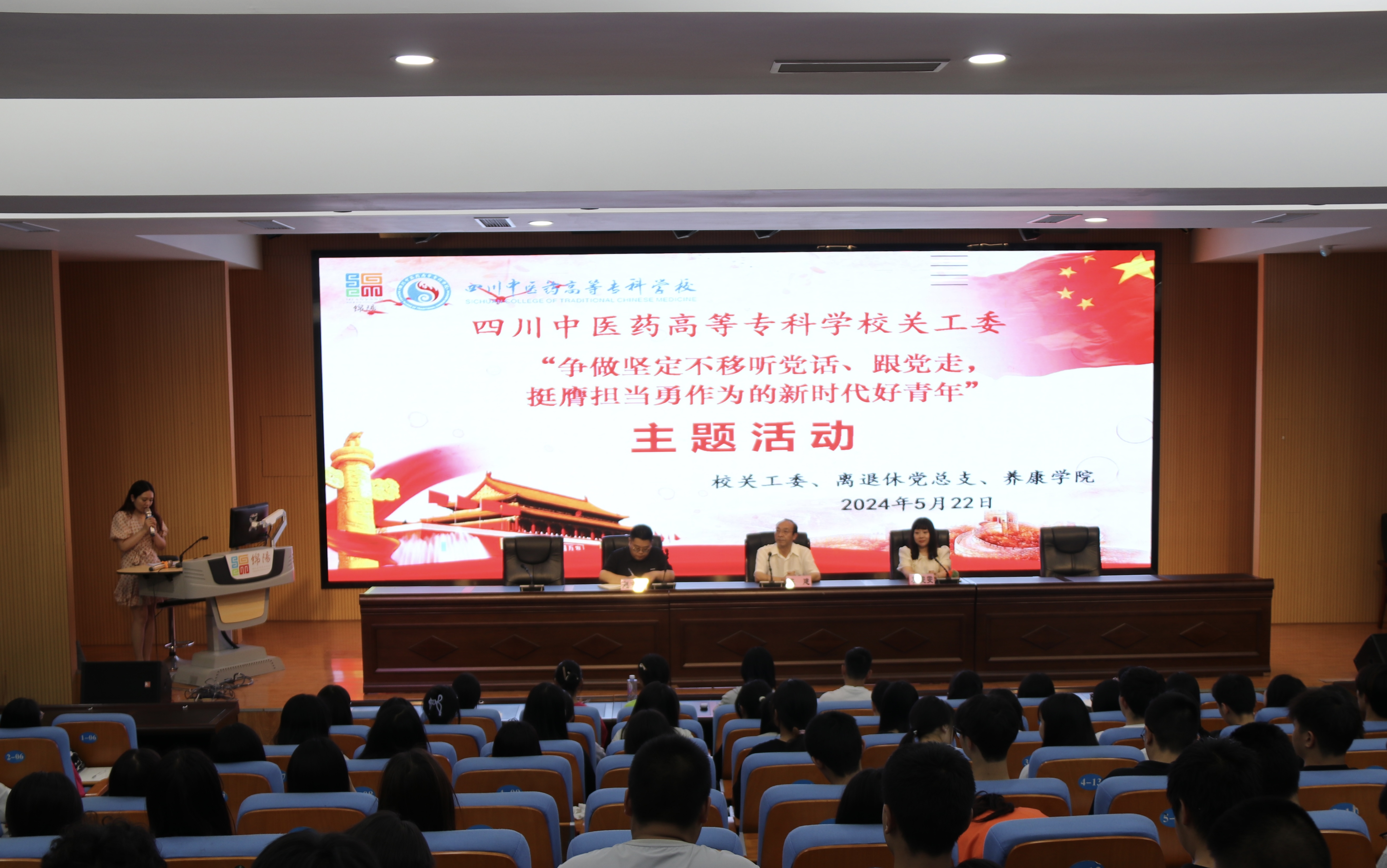 5月22日下午4点30分,四川中医药高等专科学校“争做坚定不移听党话、跟党走、挺膺担当勇作为的新时代好青年”主题活动在西校区学术报告厅举行,此次活动由校关工委主办,离退休党总支和养康学院联合承办。出席本次活动的领导有离退休老领导、原绵阳农业学校副校长陈建同志,离退休党总支书记莫雯雯同志,养康学院党总支副书记赵文钦同志,养康学院全体团员及入团积极分子参加了此次主题活动。