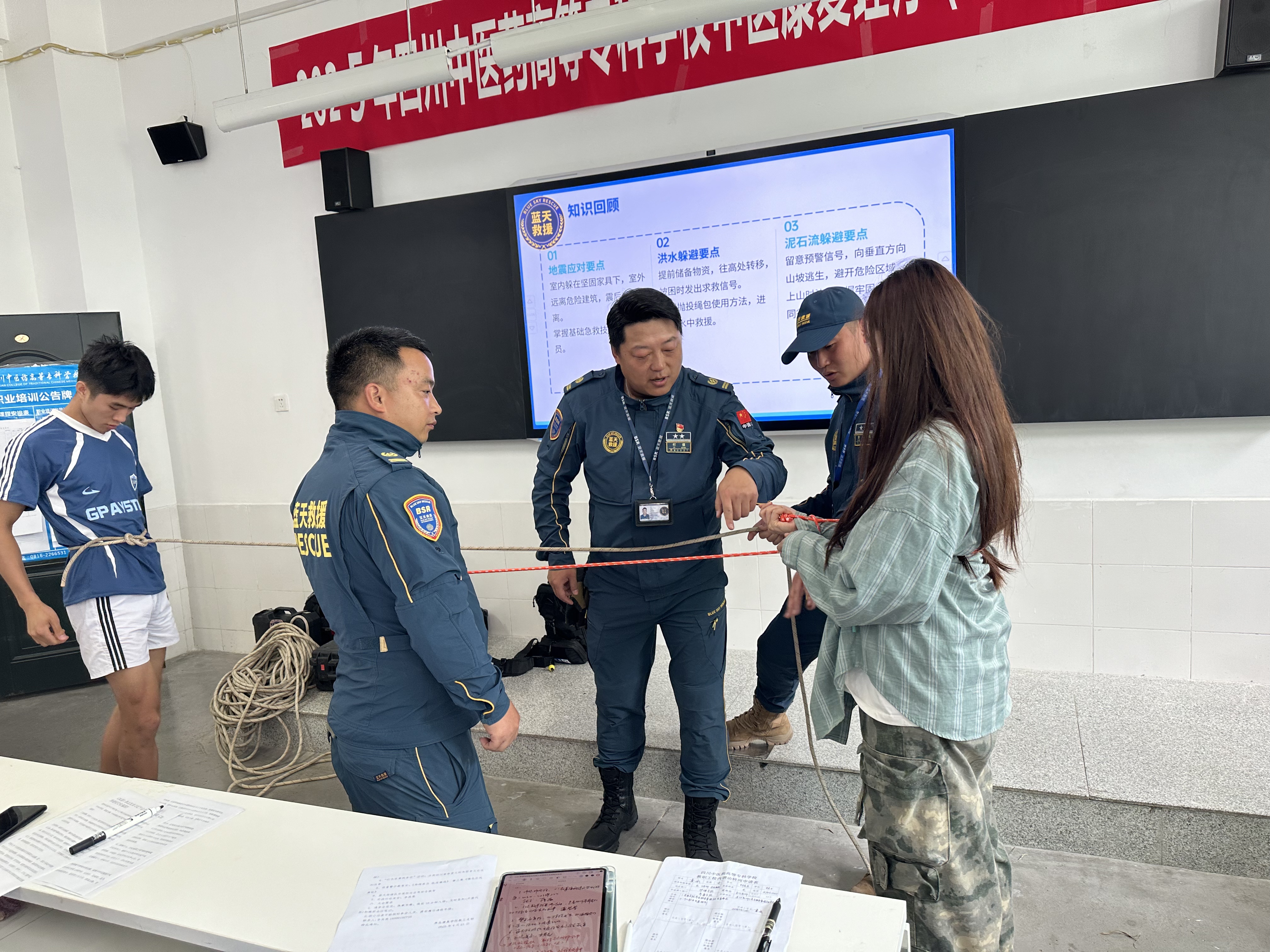 蓝天救援队的资深队员付强通过生动的案例、详实的数据和通俗易懂的语言,向师生们详细介绍了地震、洪水、泥石流等常见自然灾害的形成原因、预警信号及防范要点,还展示了浮力马甲的穿戴要领、水域救援抛投绳包的使用技巧和应急情况下绳结的捆法操作。互动环节,队员们邀请了部分师生上台进行实际操作练习,手把手地纠正错误动作,确保每位参与者都能掌握正确的技能。