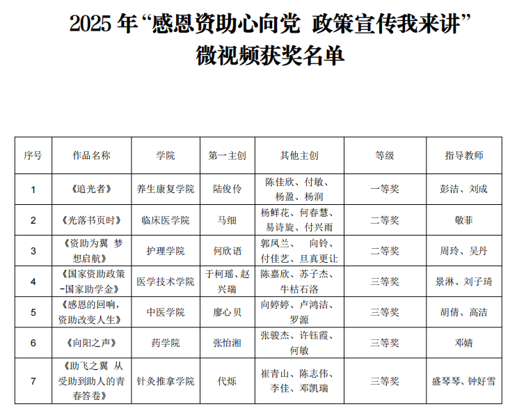 热烈祝贺我院学子在四川中医药高等专科学校2025年“感恩资助心向党 政策宣传我来讲”微视频比赛中取得优异成绩