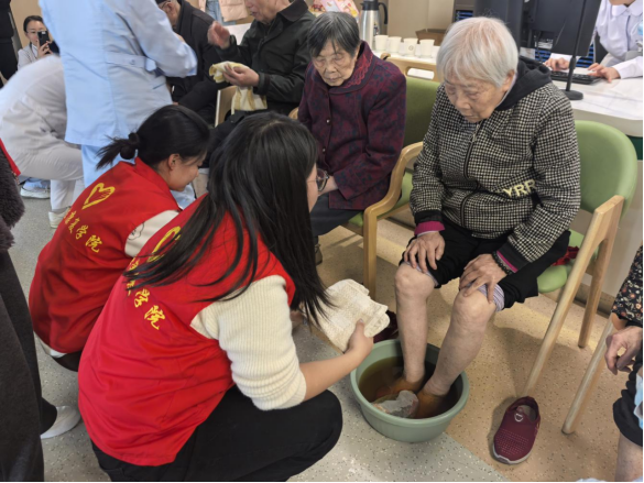 作为压轴环节,中药泡脚体验将活动推向高潮。中医学院的志愿者拿出提前配制好的足浴药包,并向老人们细致讲解各种药材的功效与泡脚宜忌。“艾叶能驱寒,红花可活血,睡前泡脚有助于安神……”志愿者们一边蹲身调试水温、分发药包,一边与老人亲切交流。氤氲的药香中,青春的专业与银龄的温暖在此刻交融,构成了一幅尊老敬贤、温馨感人的画卷。