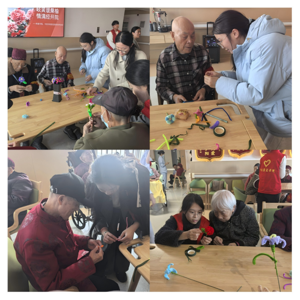 随后的“巧手生花”扭扭花手工环节,让温馨与创意充盈全场。志愿者耐心讲解、亲手示范,老人们兴致盎然地挑选色彩、精心制作。一朵朵栩栩如生的花朵在指尖绽放,不仅锻炼了老人们手脑协调能力,更在互动中拉近了心与心的距离。